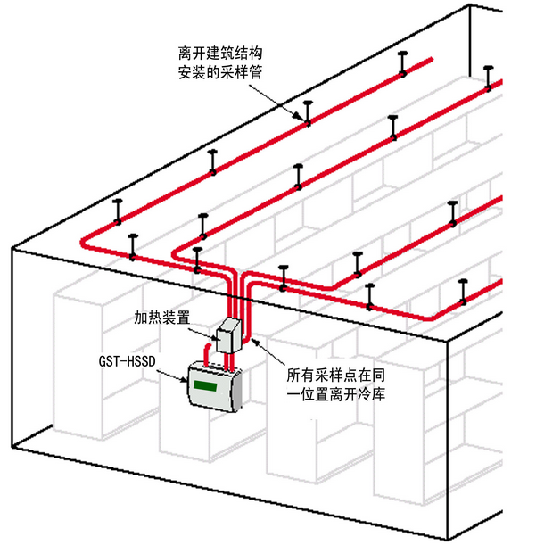 冷庫中采樣管,加熱箱和吸氣式感煙火災(zāi)探測器的相對(duì)位置